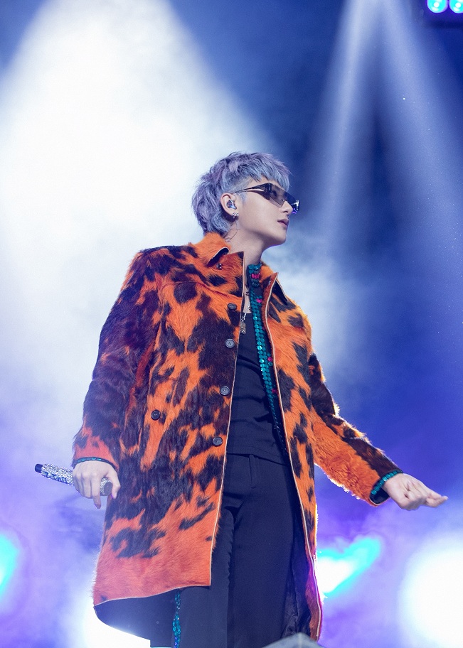 演唱会当天,黄子韬身着橙黑拼接马毛印染大衣,搭配浅灰色无边墨镜登场,气场全开,鲜艳夺目的视觉冲击感惊艳全场。